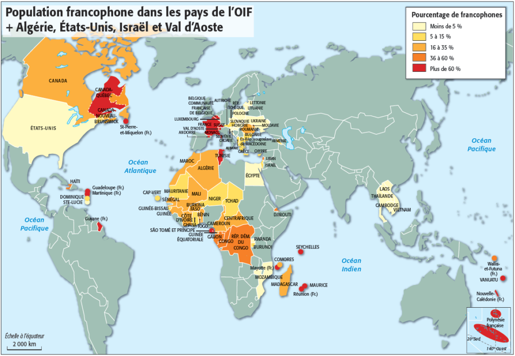 La France est présente sur toutes les latitudes par son territoire et par sa langue. La francophonie assure la diffusion de la langue et de la culture françaises. Elle est relayée par un réseau de centres culturels et d’établissements scolaires dans le monde et des chaînes d’information internationales francophones participent à sa diffusion.